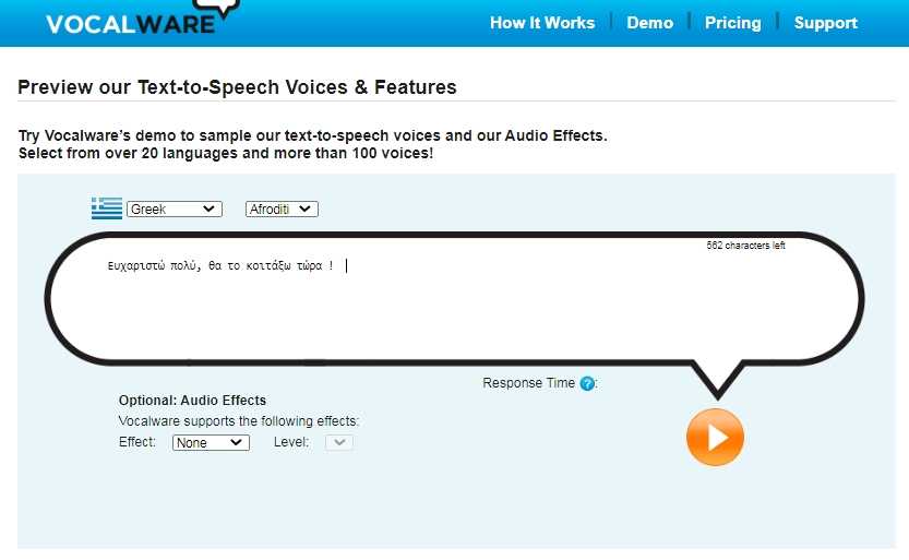 Nouveau Prononciation du grec par synthétiseur vocal Vous pouvez taper votre petit texte jusqu'à 600 caractères et ensuite l’entendre- Cela est valable pour plusieurs langues dont le grec – Il suffit de la choisir dans le menu déroulant – Vous pouvez sélectionner une voix d’homme, de femme etc.. ainsi que le personnage puis cliquer sur le bouton "Say it" pour entendre votre texte– La qualité de diction pour le grec est vraiment bonne à deux conditions - 1) il est important que le texte soit écrit sans faute d'orthographe et respecte l'accentuation. 2) il faut éviter les formes contractées du genre : στ’ αμπέλια – mais plutôt - στα αμπέλια / σ’ όλη – mais plutôt -σε όλη / απ’ το χωριό – mais plutôt -από το χωριό etc....