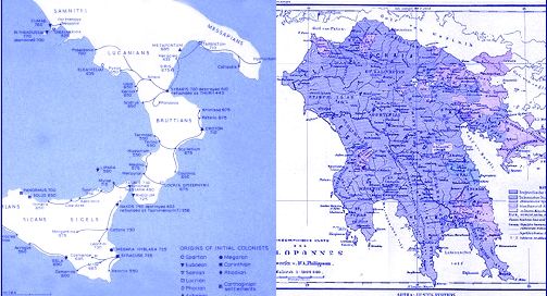Au alentour de 1100avant JC les Doriens s’installèrent dans le sud de la Grèce. Au 8ème siècle avant JC, les Doriens de Laconie fondaient Taranto, tandis que d’autres Doriens fondaient Héraclée dans le sud de l'Italie et Reggio dans la région de Calabre, villes où le dialecte dorien était principalement parlé. Peu à peu l'expansion italienne avec celle de l’Eglise catholique limita la langue grecque dans cette région à quelques villages. L'Eglise orthodoxe s’était maintenue jusqu'au 16e siècle en Calabre et jusqu’au 17ème siècle dans les Pouilles. Dans l'arrière-pays du sud de la Calabre, au sud de Reggio, près de la chaîne de montagne de l'Aspromonte et de la péninsule de Salento dans les Pouilles, au sud, et à l’est de Tarente, il existe encore de nos jours deux régions de langue grecque au sud de l'Italie. Chacun sait