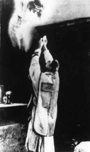 Non sans frayeur, le doyen ouvrit le tabernacle, en retira le Saint-Sacrement, et donna la bénédiction. Aussitôt le peuple d’éclater en sanglots et de s’écrier : « O Jésus, o Jésus ! » --« Pourquoi ces cris et ces larmes ? » lui-dis-je. Ils me répondirent : « Nous voyons notre bon Sauveur ! » Pour moi, je ne voyais que la sainte Hostie, ce qui m’affligeait beaucoup, car je craignais de m’être rendu, par mes péchés, indigne de la vue du Seigneur. Je fis un minutieux examen de conscience, et ne trouvai rien de particulier. Je suppliai Jésus avec larmes de me montrer sa sainte face.