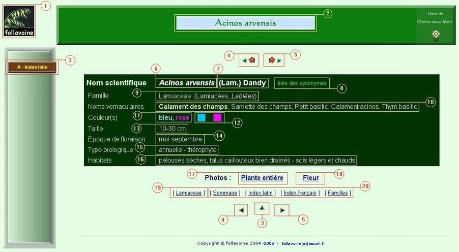 20 = liens vers les pages : Sommaire des Plantes, Index latin, Index français et Index des Familles