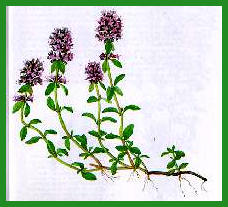 Out of infusion wild thyme is a good general tonic and disinfectant of respiratory tracts. Same indications as thyme. Also : Epatic insufficiency, gastric meteorism, rheumatism, pains, cough. In external use : Care of the hair, ulcers, irritations, nose bleed. Infusion : A few branches for one boiling cup of water, let infuse 10 minutes ; 3 cups a day. Relaxing bath; 60g of fresh plant in 2 liters of boil water, let become cold, filter; pour in the water of a bath. Compresses with an infusion; 50g of flowered tops for 1 liter of boiling water; in case of rhumatic pains.