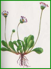 English daisy is often prescribed for hypertension and arteriosclerosis. Also : Asthma, bronchitis, laryngitis, cough, asthenia, insomnia, rheumatisms, angina sore-throat. In external use : Hematoma, burns, furuncles, ulcers, distorsions. Infusion 1 teaspoon for one cup of boiling water, let infuse 10 minutes ; 3 cups a day. Decoction; 20g of dried flowers and leaves in 1 liter of wine, boil during 5 minutes, filter, 2 glasses a day against bronchitis. Compresses with a decoction; 150g of dried flowers and leaves for 1 liter of water, boil 5 minutes; applied on furuncles.