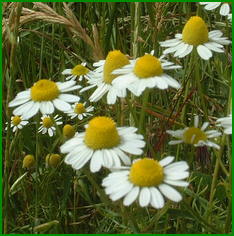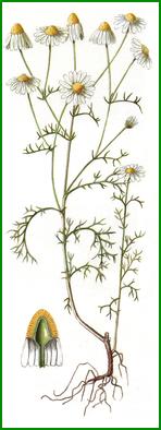German camomile has practically the same properties as the roman camomile Also : Sunstrokes, flu, insufficient menstruation, care of the hair, mounthwash, care of the skin, wounds. Infusion : 2 spoonfuls for 1/4 of liter of boiling water, let infuse 10 minutes ; 2 to 3 cups per day. Oil of camomile for sunburns; 25g of dried flowers in 250g of olive oil, gently heat in a bain-marie during 2 hours, filter, preserve in several small bottles.