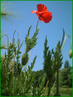 Out of infusion the poppy calms cough and bronchial affections. Also : Asthma, angina sore-throat, insomnia, colics. In external use : Eyes, dental abscesses , dry skin. Infusion : 1 pinch of flowers for 1 boiling cup of water cup, let infuse 10 minutes ; 3 cups a day. Sirrup, let infuse 12 hours in a covered container, 400 g of fresh flowers in 1 liter of ebulient water, filter, add 1.4 kg of sugar and cook in order to obtain the desired consistency.