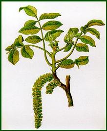 Walnut tree is at the same time purifying tonic and astringent. Usefull in case of rickets, osseous diseases, dyspepsia, digestive weakness, nausea, diabetes, diarrhoea, leucorrhea, angina sore-throat, weakness. In external use : Impetigo, abscess, ulcers, wounds, chilblain, hair fall, conjunctivitis. One handful for one liter of boiling water, let infuse 10 minutes, drink at will. Decoction of 50 g of leaves for one liter of water in lotion or compress on abscesses, ulcers, wounds, chilblain, hair loss. Wine in walnut hulls: Macerate for three months 500 g of green walnut bark in a liter of spirits, filter, add 3 liters of wine, put some sugar in; 1 glass before meals.