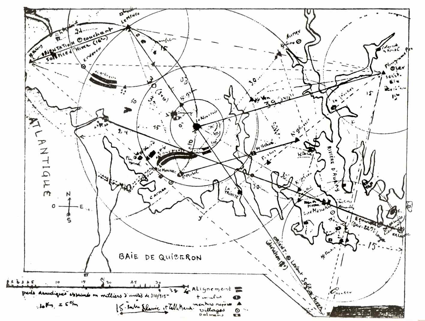 Une des grandes lignes (de celles qu'on pourrait appeler « européennes » par leurs prolongements) part de Carnac, touche Château-Meillant, Ars, Etanna, se dirige vers Assise et se prolonge ensuite en direction d'Athènes, qui n'est nullement son terme ultime. Une autre, assez particulière, relie à Carnac Paris, Reims, Mayence et se poursuit via Berlin et Moscou. Je laisse au lecteur le plaisir de repérer celle qui va, en correctif, rejoindre Vienne, l'antique Vindobona, et de calculer quelques écarts angulaires, dont je veux éviter l'exégèse. J'ai quelque lieu de mentionner le triangle Strasbourg-Lyon-Paris, sur la droite reliant