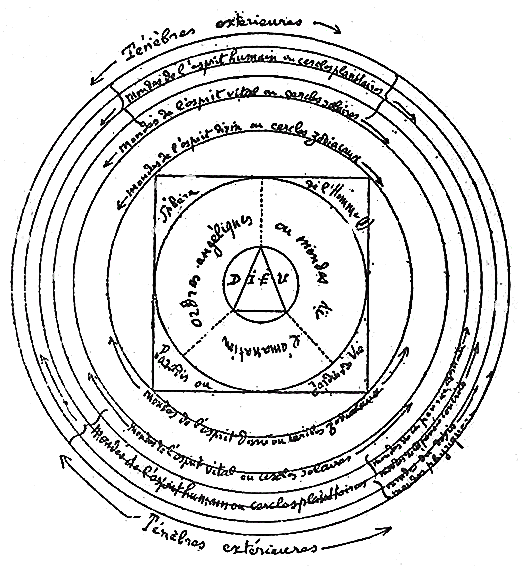Parce qu'ils sont émanés sous le signe de l'Être ou du Père, les Anges sont des essences pures, d'ordre intelligible : la théologie thomiste les désigne du nom d'Intelligences séparées. L'objet de leur connaissance est toujours en acte, parce que les idées représentatives des choses leur sont innées, connaturelles, au même titre que leur propre essence. Parce qu'il est créé sous le signe de la Vie ou du Verbe, l'Homme est une Pensée vivante, une essence d'ordre spirituel, un Esprit. Des occultistes l'appellent un Esprit vierge, parce qu'il renferme dans sa seule substance toute la lignée des Esprits qui doivent dériver de lui dans la suite des Temps et peupler sous sa domination les Jardins de Vie ou les Paradis Célestes. Mais, tandis que les Anges sont incorporels (1), en ce sens que leur être n'est pas naturellement et nécessairement uni à un véhicule de matière, même subtile, l'Esprit de l'Homme est entouré d'une enveloppe fluidique qui constitue son Corps de vie et a pour effet de le situer dans l'Espace, créé le deuxième jour avec le Firmament ou Ciel éthérique. Immatériels, les Anges sont incorruptibles en vertu de leur nature propre ; revêtu d'un corps, l'Homme n'est incorruptible que par le don gracieux de la Toute-puissance divine. Car dans ce corps de Vie Dieu a introduit, le sixième jour de la création, une âme de Vie destinée à servir à son Esprit d'un instrument qui pût animer, mouvoir et diriger son corps ; et cette âme, Dieu la fit immortelle. Et à l'Homme, ainsi constitué et établi dans le Paradis de Vie, Dieu présenta chacune selon son espèce, pour qu'il leur donnât un nom, toutes les semences de Vie (2) qu'il avait déposées dans l'Espace éthérique aux jours successifs de la Création et d'où devaient être engendrés tout végétal et tout animal. A chacune de ces Âmes de Vie l'Homme conféra, selon son espèce, un Nom ; mais il n'en trouva aucune qui fût semblable à lui. Dieu lui fit alors connaître qu'il lui déléguait le pouvoir de former un être semblable à lui, mais à la condition que son opération fût consacrée à la gloire du Très-Haut et exécutée dans la plus stricte obéissance à ses commandements. Et Dieu déclara qu'il bénirait son oeuvre. L'Homme commença aussitôt les préparatifs de son opération (3); mais à peine en avait-il accompli les premiers gestes qu'une ombre immense se leva à l'horizon et couvrit le soleil d'un voile ténébreux. Dans la nuit qui montait, l'Homme sentit une torpeur inaccoutumée l'envahir tout entier et son âme s'assoupit : pour la première fois, il s'endormit. Pendant son sommeil, l'uvre qu'il avait projetée se réalisa. Mais, à son réveil, quelle ne fut pas sa surprise ! L'être qui se tenait devant lui, resplendissant d'une étrange beauté, n'était pas semblable à lui ; ce n'était pas un être spirituel, mais une simple forme fluidique, sans âme ni vie. L'Homme invoqua le Très-Haut et Dieu, fidèle à sa promesse, insuffla une âme de Vie et un Esprit à l'oeuvre inerte sortie des mains de l'Homme. Et l'Homme la nomma HÉVA, pour être sa compagne, née de son corps. Mais aussitôt ils aperçurent qu'ils étaient nus, c'est-à-dire dénués de toute vertu propre et de lumière, stériles. Et l'Homme, qui n'était plus qu'Adam, entendit la voie courroucée de Dieu qui lui reprochait sa faute, et lui annonça les châtiments qui le frapperaient, lui et ses descendants. Et, après les avoir pourvus de tuniques de peau (4), Dieu chassa du Paradis céleste le couple humain. Ainsi commença pour l'Homme et sa postérité, à travers des mondes nouveaux, le pèlerinage des existences successives. Ces mondes nouveaux, la Kabbale juive les appelle mondes de la formation ou Ietsirah ; les occultistes les désignent du nom de mondes astraux ou éthérique. On doit les placer sous le signe de la Lumière ou de l'Esprit, de même que les mondes de l'émanation sont placés sous le signe de l'Être ou du Père, et celui de la création sous le signe de la Vie ou du Verbe. Mais, ainsi qu'il y a des degrés dans la Lumière, il y a une hiérarchie entre les mondes qui composent la sphère de l'Esprit ; et la descente de l'Homme à travers ces mondes va s'effectuer, en quelque sorte, par étapes successives qui constitueront chacune un plan de l'involution et, dans leur ensemble, le domaine de la Manifestation formelle. L'esprit, à chaque étape de son involution, se revêtira de formes ou de véhicules de plus en plus denses, jusqu'à ce qu'il ait atteint, dans un corps de mort (5), le nadir de la matérialité. Pour ne pas entrer dans le détail, je dirai simplement qu'on peut distinguer trois plans principaux : tout d'abord les plans zodiacaux, qui constituent les mondes de l'Esprit divin ; puis les plans solaires qui constituent les mondes de l'Esprit vital ; enfin les plans planétaires qui constituent les mondes de l'Esprit proprement humain. Et dans ces derniers on peut énumérer trois autres plans : le plan mental (mondes de la pensée abstraite et de la pensée concrète), le plan émotionnel (mondes du désir) et le plan physique (mondes organiques et chimiques) (6). Ce dernier porte dans la Kabbale juive le nom de monde de la faction ou Assayah ; il est à la limite de la Sphère de l'Esprit ou de la Lumière : au-delà s'étend le Domaine des Ténèbres, ces Ténèbres que l'Évangile appelle extérieures, parce qu'elles sont en dehors de Dieu et livrées à la domination de Satan. II. - Tableu figuratif de la sphère de l'homme (7) et des sphères de l'Esprit