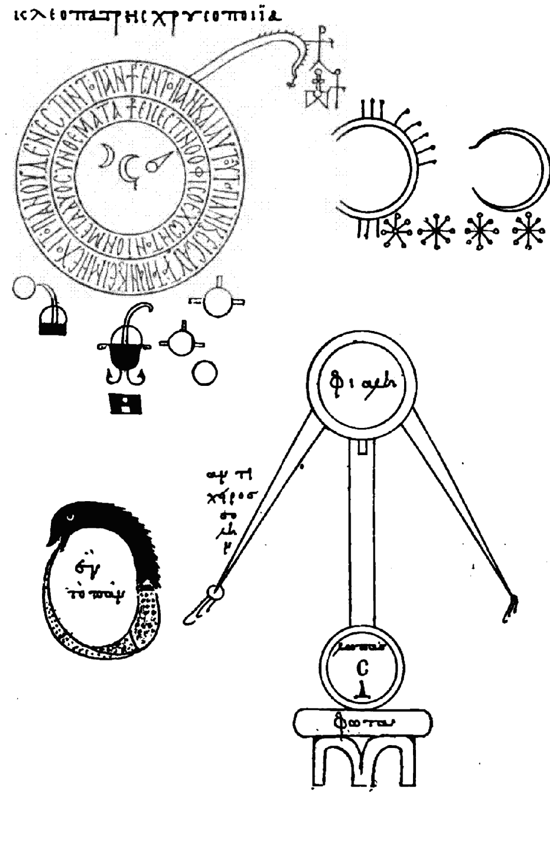 Figure 11. — Chrysopée de Cléopâtre. p133 Commentons les diverses portions de cette grande figure: 1° Au-dessous du titre se trouve un premier dessin, formé de trois cercles concentriques. Au centre des cercles, les signes de l’or, de l’argent (avec un petit appendice) et du mercure. Dans l’anneau intérieur: Εἰς ἐστιν ὁ )όφις ὁ ἔχων τὸν ἰὸν μετὰ δύο συνθέματα : « le serpent est un, celui qui a le venin, après les deux emblèmes. » Dans l’anneau extérieur: Ἓν τὸ πᾶν καὶ δι' αὐτοῦ τὸ πᾶν καὶ εἰς αὐτὸ τὸ πᾶν καὶ εἰ μὴ ἒχοι τὸ πᾶν οὐδέν ἐστιν τὸ πᾶν (02). « Un est le tout et par lui le tout et vers lui le tout; et si le tout ne contient pas le tout, le tout n’est rien. » A droite, le cercle extérieur se prolonge par une sorte de queue, qui montre que ce système est la figuration du serpent mystique. 2° Puis viennent divers appendices et signes d’apparence magique, situés à droite, dont la signification est inconnue. Cependant je serais porté à rapprocher Le double cercle incomplet, muni de huit appendices supérieurs, du signe de l’Écrevisse à huit pattes antérieures, dessiné figure 28; lequel est traduit par les mots: molybdochalque (alliage de plomb et de cuivre) brûlé, et argyrochalque (alliage de cuivre et d’argent) brûlé. Ces signes seraient alors les symboles chimiques d’une opération de transmutation du plomb en argent, de même que ceux de la figure 28. Au-dessous des grands cercles sont des signes répondant à des opérations chimiques, exécutées dans certains appareils que je vais énumérer. 3° Tel est le petit dessin central, représentant un appareil pour fixer les métaux. Il est posé sur un bain-marie, muni de deux pieds recourbés et placé lui-même au-dessus d’un fourneau. Cet appareil est pourvu d’un tube central qui le surmonte, tube destiné sans doute au départ des gaz ou des vapeurs. Ce dessin est reproduit d’une façon plus précise, avec le mot phxiV sur le folio 220 du manuscrit 2327 (v. fig. 13, à droite). 4° Le petit dessin, situé à gauche du précédent, représente un appareil analogue, avec un ballon supérieur, destiné à recevoir les vapeurs dégagées par la pointe du tube. Le tout répond à l’alambic de gauche de la figure 13. 5° Les deux petits cercles, situés à droite et munis de trois appendices p134 rectilignes, semblent représenter des appareils avec leurs trépieds posés sur le feu; tels que celui de gauche des figures 13 et 38. On pourrait en rapprocher aussi. le symbole du botarion (fig. 5, l. 4 et fig. 7, l. 27), représentant un vase à digestion sur son fourneau, analogue au dessin situé gauche et en bas de la figure 37 et au dessus situé à droite de la fig. 38. 6° Le cercle intérieur, muni d’un point central, symbolise l’œuf philosophique (?), ou le cinabre (Voir fig. 4, Pl. II, l. 13, et la note de la page 122). 7° Vers le bas à gauche, est figuré le serpent Ouroboros, avec l’axiome central: Ἓν τὸ πᾶν, le tout est un. 8° Sur le côté droit du serpent, un grand alambic à deux pointes (dibicos), posé sur son fourneau, lequel porte le met φῶτα, feux. Le récipient inférieur, ou chaudière, s’appelle λωπάς, matras. Le récipient supérieur, dôme ou chapiteau, est la φιάλη, mot qui signifiait autrefois tasse ou coupe mais qui a ici le sens plus moderne de fiole ou ballon renversé. Voici l’usage de cet alambic. La vapeur monte du matras, par un large tube, dans l’ouverture plus étroite du chapiteau ou ballon renversé; elle s’y condense et s’échappe goutte à goutte, par deux tubes coniques et inclinés. A côté du tube gauche, se trouvent, les mots ἀνίχειρος σολήν (sic) tube du pouce, ou plutôt contre-tube ; attendu que le rôle de ce tube descendant est inverse du rôle du tube ascendant, qui joint le matras su chapiteau. La figure de la Chrysopée de Cléopâtre existe, sous le même titre et avec ses diverses portions essentielles, dans les manuscrits copiés directement sur celui de Saint Marc; elle en caractérise la filiation. Dans les manuscrits 2325, 2327 et dans leurs dérivés, le titre a disparu; mais la figure subsiste encore, moins belle et moins nette, avec les axiomes mystiques qui la caractérisent. Les annexes : alambic à une ou deux pointes, vases à fixation et trépied, y ont été aussi modifiés dans leur forme. Cependant le tout existe à la même place du texte, c’est-è-dire en tête des ouvrages de Zosime sur les instruments (2327, fol. 220; 2325, fol. 82). Figure 12. — Je donne ici le décalque des appareils représentés dans le manuscrit 2325 (fin du xiiie siècle) : ces dessins sont bien plus grossiers. Je n’ai pas cru utile de reproduire la figure même des trois cercles concentriques, qui sont à peu près pareils à ceux de la figure 11; mais je vais en indiquer les inscriptions, à cause des variantes. p135 L’anneau extérieur porte la même inscription, à demi-effacée et avec des suppressions : ἓ τὸ πᾶν δι' αὐτὸ πᾶν (καὶ δι' οὗ τὸ πᾶν) πᾶν καὶ ἐν αὐτῷ τὸ πᾶν Dans l’anneau intérieur, on lit : εἷς ἐστὶν ὁ ὄφις ὁ ἔχων τὰ δύο συνθέματα καὶ τὸν ἰόν. Au centre de droite à gauche, on voit les signes de l’or, de l’argent, du mercure, du plomb. Au-dessus, le cinabre (ou l’œuf philosophique), qui se trouvait en dehors des cercles dans la figure du manuscrit de St Marc (6.). Venons maintenant à la portion du dessin du manuscrit 2325 que j’ai reproduite dans la figure 12: