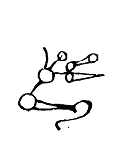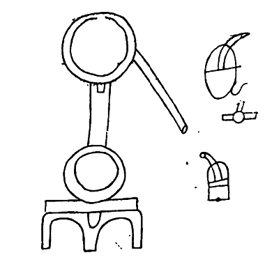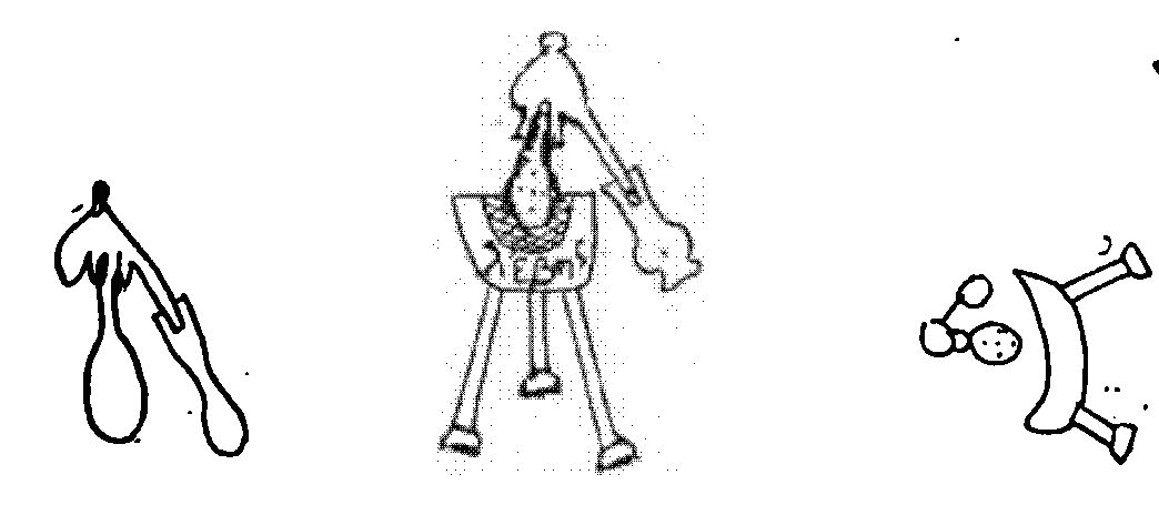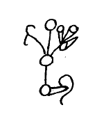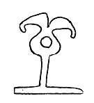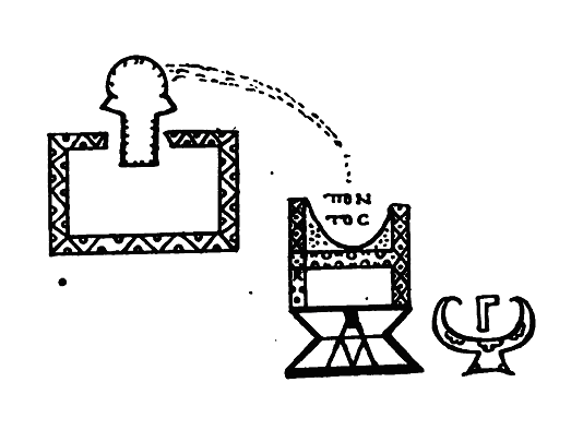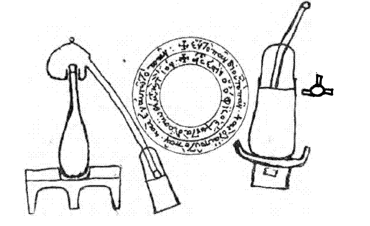 Figure 17. — Tribicos. (Ms 2325) Décalque. Figure 18. — Elle se trouve au folio 10 du manuscrit de Saint Marc, entre la première et la deuxième leçon de Stephanus ; elle est dessinée à l’encre rouge et contemporaine du texte. La signification en est difficile à préciser p142 avec certitude. Cependant il semble qu’il s’agisse d’une chaudière à tête élargie en forme de