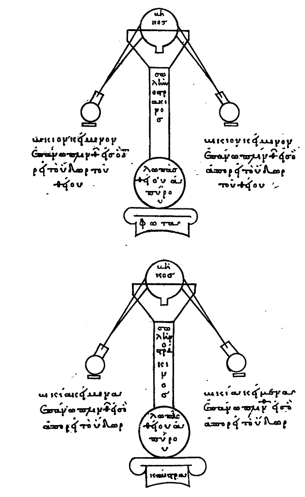 Figures 14 et 14 bis, — Alambic à deux récipients (dibicos). Réduction aux 2/3. p139 à moins qu’ils n’y soient représentés par deux signes inconnus, située au-dessous de λωπάς. En tout cas, ils concordent avec la description du texte, dans lequel il est dit que l’on mettait du soufre dans le matras. Le tube ascendant porte les mots σωλὴν ὀστράκινος : tube de terre cuite. Le chapiteau ne s’appelle pas φιάλη mais βῆκος, pour βίκος: amphore. Les deux petits ballons destinés à recevoir les liquides distillés s’appellent également βιλίον et tous deux portent la légende : κείμενον ἐπάνω πλίνθου εἰς ὃ ἀπορρεῖ τὸ ὕδωρ τοῦ θείου, c’est-à-dire « le ballon placé au-dessus de la tablette rectangulaire, dans lequel s’écoule l’eau du soufre. » Ceci, joint à l’inscription de la λωπάς, montre que cet alambic est destiné à la préparation de l’« eau de soufre ». Cette figure est répétée deux fois dans le manuscrit de Saint Marc, sauf que les mots βικίον κείμενον sont remplacés par le pluriel βικία κείμενα, et le mot φῦτα par le mot καύστρα : fourneau à combustion ; les mots τοῦ θείου manquent la seconde fois. Figure 15 (manuscrit de Saint Marc, fol. 194, verso). — Cette figure est p140 un alambic à trois récipients (βικία), ou tribicos. Le fourneau porte ici les deux mots superposés καύστρα: (lieu de la combustion) et φῶτα (lieu de la flamme). Le matras s’appelle de même : λωπὰς θείου ἀπύρου. Enfin on distingue le tube ascendant, ou tube index, λιχανὸς σωλήν c’est-à-dire tube direct du tube, descendant ou tube du pouce, ἀντίχειρος σωλήν, c’est-à-dire tube inverse (par sa direction).