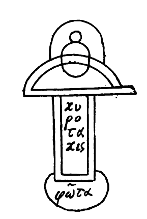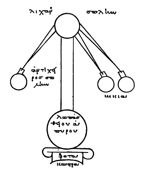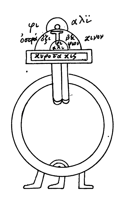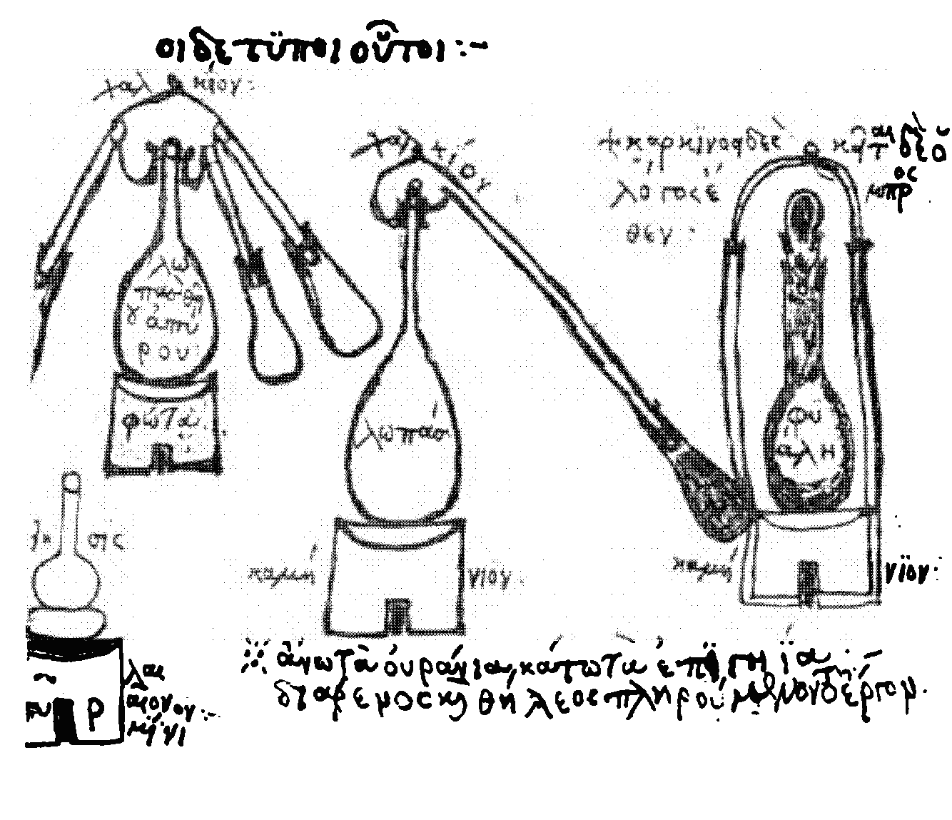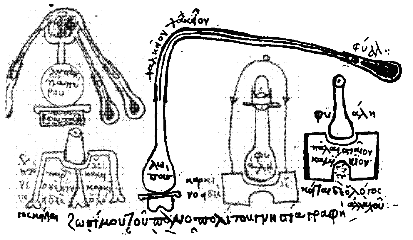 Figure 12. — Alambic de vase à fixation (Décalque du Ms. 2325.) A gauche des cercles, on voit l’image grossière d’un alambic à une pointe, avec condensateur supérieur et matras inférieur, le tout de la même forme générale que la portion 8° de la figure du manuscrit de St Marc. A côté, deux appareils à fixation, à pointe tournée vers le haut, lesquels sont évidemment imités des portions 3° et 4° de la fig. 11. Il en est de même d’un dernier reste du petit cercle à 3 appendices ou trépied, coupé dans le manuscrit 2325 par le relieur, mais qui se retrouve intact dans le manuscrit 2275, lequel a toute cette figure. En effet, le manuscrit 2275 (daté de 1465) reproduit les cercles concentriques, l’alambic à une pointe, les 2 vases, et le petit trépied, pris avec des formes qui semblent fidèlement copiées sur le 2325, lequel est d’ailleurs beaucoup plus ancien. p136 Figure 13. — Elle reproduit les dessins analogues du manuscrit 2327, fol. 220 (xve siècle). Les inscriptions des cercles concentriques sont identiques à celles du manuscrit 2325, sauf l’absence des symboles centraux. Par contre, au folio 80 du 2327, au début d’une autre copie du même ouvrage de Zosime, les cercles concentriques ont été supprimés, probablement faute de place, par le copiste; mais il a transcrit à l’encre rouge les axiomes mystiques, suivis des signes du plomb, de l’argent, du mercure et de l’or, surmontés par celui du cinabre (ou de l’œuf), exactement comme dans le manuscrit 2325. Au verso du fol. 80 (2327) existent les dessins de l’alambic à une pointe, avec condensateur supérieur, φιάλη, et matras, λωπάς, conformes à la figure 11 et à la figure 13 mais mutilés par le relieur. Sur la même page, on voit encore un appareil à fixation métallique, semblable à celui de la figure 13. Il y a des inscriptions sur les divers appareils du folio 80, telles que πῆξις sur l’appareil à fixation; (καμ) ήνιον, sur son fourneau et sur celui de l’alambic; λωπάς, sur le matras de ce dernier; (φι) άλη deux fois répétés, sur son chapiteau.
