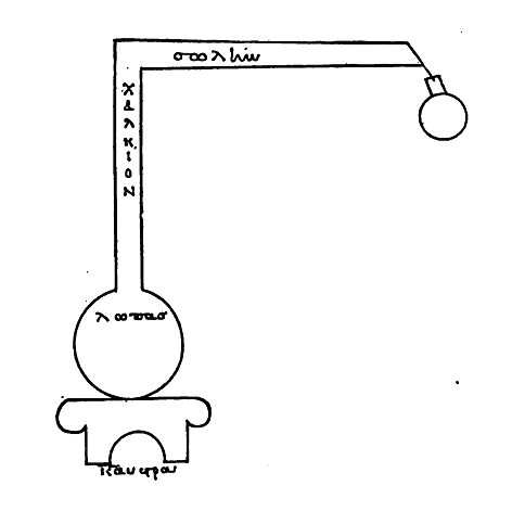 Figure 15. — Alambic à trois récipients (tribicos). Réduction aux 2/3. Cette figure se retrouve dans les manuscrits 2325 et 2327 dans le dernier avec modifications considérables : je les signalerai tout à l’heure. Figure 16. —Cette figure (manuscrit de Saint Marc, fol. 194 verso, au- dessous de la précédente), est un alambic à col de cuivre, χαλκίον, avec un seul tube, σωλήν, gros et fort, coudé à angle droit à sa partie supérieure et conduisant la vapeur, de la λωπάς au petit ballon.