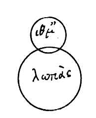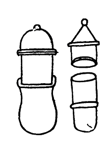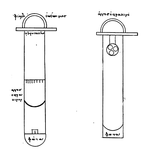 26. — Récipients supérieurs des figures 25 et 27. le mot λωπάς pour le plus grand, et un nom abrégé pour le plus petit, situé au-dessous. Ce mot semble être p151 iou abréviation avec iotacisme, remplaçant couvercle percé de trous. Figure 27. — Dans ce dessin il n’y a pas de vase à digestion et l’action du foyer s’exerce directement. Le mot κυροτακίς est inscrit sur la portion verticale du dessin, au-dessus du feu; mais il est probable que c’est faute de place pour l’inscrire sur la partie horizontale et supérieure. Cet appareil doit être rapproché des figures 20 et 21, c’est-à-dire des aludels, plutôt que des bains-marie des figures 22, 23, 24 et 25.