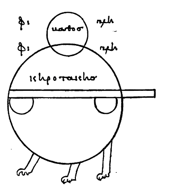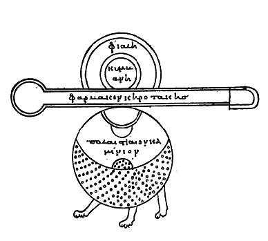 Figure. 45. — Fiole. Décalque. Figure 43. Alambic avec six appendices. Décalque. Figure 43. — Cette figure (manuscrit 2327, fol. 184 verso), malheureusement coupée par le relieur, se trouve vers la fin du poème de Théophraste. On y discerne un alambic, mais avec un appendice supérieur, fort singulier dont la position rappelle la κρόταλις. Il est muni de six lignes verticales répondant au texte suivant : φέροντας τάς ἓξ ζώνας ὡς τίφμα (sic) φάγαι. Portant six ceintures (enveloppes) pour absorber la matière fondue.) p166 Figures du manuscrit 2325Les figures du manuscrit 2325 sont très intéressantes parce qu’elles répondent à une époque intermédiaire (xiiie siècle) entre celui de Saint Marc et le n°2317 de Paris. Elles sont en général conformes à celles du manuscrit de Saint Marc, bien que le manuscrit 2325 n’en dérive certainement pas directement, comme je le montrerai. Il résulte de cette double circonstance que la date des dessins du 2325 est antérieure, à la copie actuelle du manuscrit de Saint Marc, et même à la date de ses prototypes immédiats; cependant ils doivent dériver tous les deux de quelque source commune et plus ancienne. Quant au détail, le nombre, la forme et la dimension des parties des appareils sont assez différents, pour quelques-uns du moins. Le manuscrit 2325 contient en plus l’alambic de Synésius, figure 41, et le dessin (fig. 33) mystique de la 3e leçon de Stéphanus. Par contre, les appareils à digestion y sont moins multipliés. Nous avons donné les figures essentielles de ce manuscrit, telles que : la figure 41 (fol. 23 verso) représentant l’alambic de Synésius, avec la chaudière (λέβης), et le feu (πῦρ). La figure 17 (tribicos), est analogue à celle du manuscrit de Saint Marc (fig. 15). Toutefois les dimensions relatives du matras à soufre (λωπὰς θείου ἀπύρου), du tube vertical, du condensateur supérieur et des ballons qui recueillent le produit distillé sont différentes; le dessin de l’un de ces ballons a même disparu. — En outre, le mot pur (feu) a remplacé καύστρα (foyer). La figure du tribicos, de même que toutes celles du manuscrit 2325, est beaucoup plus grossière que celles du manuscrit de Saint Marc. A côté se trouve également, très grossièrement dessiné, l’appareil distillatoire à large tube de cuivre (χαλκίον), de la figure x6; mais j’ai jugé inutile de reproduire ce dessin du manuscrit 2325. Au-dessous du tribicos, on voit la figure 23 donnée plus haut: c’est celle d’un appareil à kérotakis, analogue à celui de la figure 22. Mais le fourneau (παλαιστιαῖον καμίνιον) est plus petit et les condensateurs supérieurs (φιάλη), sur l’extérieur, sont plus gros. Les ponctuations, indicatrices de trous sur p167 le bain-marie, couvrent un espace bien moindre. Le mot de kérotakis n’y figure pas. Enfin, au-dessous du σωλὴν et du χαλκίον, on voit un autre appareil à kérotakis, reproduisant le καρκίνος de la figure 25, avec des variantes trop légères pour que j’aie cru utile de le donner. On remarquera que les figures sont moins nombreuses dans le manuscrit 2325 que dans le manuscrit de Saint Marc; elles sont d’ailleurs concentrées en tète du mémoire de Zosime, dans le manuscrit 2325 aussi bien que dans le manuscrit 2327. Ce mode de distribution est évidemment plus moderne que celui du manuscrit de Saint Marc. Figures des manuscrits de Leide.L’histoire des appareils alchimiques tire une nouvelle lumière de l’examen des manuscrits alchimiques grecs de Leide. L’un d’eux (Codex Vossianus, in 4°, n° 47), fort mal écrit d’ailleurs, reproduit presque toutes les figures du manuscrit de Saint Marc, entre autres Nos trois planches 1, II, III (fig. 3, 4, 5), sauf quelques inversions; La Chrysopée de Cléopâtre de la figure 11 (fol. 49 verso); La double figure 14 et 14 bis du dibicos (fol. 50 verso); La figure 15 du tribicos (fol. 51 verso); La figure 16 de l’appareil distillatoire (fol. 51 verso) La figure 18 de la chaudière distillatoire (fol. 58 recto); Les deux appareils cylindriques de nos figures 20 et 21 (fol. 53 verso); Les kérotakis de nos figures 22 et 24 (fol. 52 verso); La palette de la figure 24 bis (fol. 53 recto); La figure 25 du vase à kérotakis, portant à côté le mot καρκινοειδὲς; (fol. 55 verso); Les récipients de la figure 26 (fol. 55 verso); Le vase à kérotakis cylindrique de la figure 27 (fol. 55 verso); La figure 31 cordiforme (fol. 51 recto); La formule magique de l’Écrevisse (fig. 28), avec son explication (fol. 70 recto), fidèlement copiée. p168 Il est clair qu’il s’agit dans tout ceci d’une simple copie, directe ou indirecte, des figures du manuscrit de Saint Marc. L’autre manuscrit de Leide est noté xxiii. Ru. 6 (ayant appartenu à Ruhnkenius); il a été écrit au xviie siècle et est fort analogue par sa table, laquelle forme une grande partie de son contenu, à notre manuscrit 2327. Il en reproduit textuellement tout le tableau des signes, c’est-à-dire les cinq pages qui forment nos figures 6 à 10, planches IV à VIII. Aux folios 21 et 22, il renferme diverses figures pareilles, avec des variantes dans les inscriptions et dans les dessins, dont quelques-unes fort importantes. Je vais les signaler : Folio 21 alambic de Synésius, conforme à la figure 40 ci-dessus; mais il porte quatre mots, au lieu du seul mot λέβης inscrit au manuscrit 2327, mot qui se retrouve d’ailleurs aussi sur la marmite, dans le manuscrit Ru. On y lit en outre λωπὰς sur le matras, φιάλη sur le chapiteau, δοχεῖον sur le récipient. Au-dessous on voit 5 dessins intéressants, savoir, de gauche à droite 1° Un alambic à une pointe, correspondant à celui des figures 13 et 37. Il porte les mots καμίνιον sur le fourneau, λωπάς sur le matras. La forme du chap
