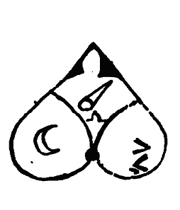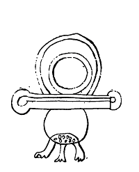 Figure 34. — Serpent Ouroboros. — D’après décalque. la Chrysopée de Cléopâtre; mais de plus il a ici trois oreilles et quatre pattes. La tête, les oreilles et l’anneau extérieur sont peints en rouge vif (r r r) ; le blanc de l’œil est blanc, la pupille noire; le premier anneau est écailleux. Le second anneau (moyen) est écailleux et jaune (j j j). L’anneau intérieur est d’un vert continu (n n), ainsi que les pattes. Ces couleurs d’ailleurs ne répondent pas exactement une description de Stéphanus (Lettre à Théodore), d’après laquelle l’origine de la queue est blanche comme du lait; le ventre et le dos, couleur de safran, la tête noir verdâtre. Il devait y avoir bien des variantes. Au folio 279 du même manuscrit se trouve une seconde figure du serpent, avec un texte un peu différent: celui-ci n’a que deux anneaux ou cercles; ses écailles sont mieux marquées. p160 Figure 35. — Cette figure (manuscrit 2327, fol. 297 verso) représente le signe d’Hermès, assez informe; le folio a été remonté sur une bande blanche.