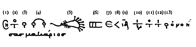 Figure 28. — Formule de l’Ecrevisse. — Réduction aux 2/3. réputée contenir le secret de la transmutation. Elle se trouve[7] à la fin des Mémoires de Zosime (manuscrit de Saint Marc, fol. 193). Son interprétation est donnée, en même temps que sa répétition, sur la première page de garde du manuscrit de Saint Marc, dans un texte dune autre écriture, plus moderne (xive siècle) que le reste. Le tout se trouve aussi dans le manuscrit de Leide, Voss., in 4°, n° 47, fol. 70. La première page de Saint Marc débute par la description du traitement des scories, lequel paraît se rapporter au changement d’une scorie noire et métallique, telle que celle du plomb, en un composé blanc (carbonate ou sulfate), sous l’influence prolongée de l’eau et de l’air. La description, écrite dans un grec barbare, se termine par ces mots: « Ainsi a été accomplie avec le secours de Dieu, la pratique de Justinien. » (Texte grec, II, iv bis, appendice I). Puis viennent le nom de la tutie, ou oxyde de zinc impur, suivi par des mots magiques, analogues à ceux qui figurent dans les Papyrus de Leide, dans Jamblique et dans le manuscrit 2419. p153 Les voici: Τουτία μαραζὴ· ασενκὴρ. αζὴ. νανπράτετ. μηρηχανῆτ. χαντήτ. μουχάναρ. πουμὰν. ναιμαρὶχ. τεχμηριζοχρὰ. ροσουχ. ταρὴτ. χηλσὶ. χηρσί. τζιάλπησιν. παρά. κολπαχσρί. Il semble que ce soient là des formules que l’on récitait au moment du traitement de la tutie, minerai de zinc (mêlé de plomb et de cuivre) employé dans l’opération de la diplosis, c’est-à-dire de la transmutation. En effet, à la suite, se trouve la formule de l’Ecrevisse, surmontée de mots qui en interprètent chacun des signes.[8] J’ai numéroté les signes dans la figure, pour donner plus de clarté aux explications. Le premier signe (n° 1) se traduit (fig. 8, Pl. VI, l. 24) par σημεῖον ou σημείωσαι = notez : c’est un signe employé fréquemment à la marge des manuscrits, pour désigner un passage important. Au-dessus, ce signe.est ici répété, avec le mot παῖ ; c’est-à-dire : Attention! initié. Le second signe (n° 2) est traduit au-dessus par τὸ πᾶν ce qui veut dire la composition ou le mélange complet. Ce mot signifie aussi le molybdochalque (plomb et cuivre, sans doute associés au zinc), d’après un passage de Zosime. Cet alliage métallique résultait en effet de la réduction de la cadmie ou de la tutie impure, substance dérivée du grillage de certains sulfures métalliques et qui semble avoir été désignée parfois, en extension d’une dénomination appliquée à ces sulfures eux-mêmes, par le nom de magnésie. On peut le conclure avec probabilité, d’après un passage de Geber sur les esprits ou matières volatiles, et d’après quelques textes des alchimistes grecs. Le troisième signe 3 est celui du cuivre. Il est traduit au-dessus par χαλκοῦ ἰὸς : la rouille du cuivre. On introduisait sans doute cette rouille dans le mélange contenant de la tutie, avec l’intention d’y augmenter la dose du cuivre : ce qui rapprochait la teinte de l’alliage de la couleur de l’or. p154 Le quatrième signe (n° 4) répond à celui du cuivre, deux fois répété et assemblé par le signe du plomb ; ainsi que le montre la traduction superposée : μολιβόχαλκος κεκαυμένος, molybdochalque (cuivre-plomb) brûlé. Le cinquième signe (n° 5) est celui de l’Écrevisse, ou du Scorpion, pourvu de huit pattes antérieures. Dans certains manuscrits (Saint Marc), la queue se termine par un dard, à la façon du Scorpion; dans d’autres (2325 et 2327 par exemple), par un demi-cercle, formant une sorte de pince. Ce signe porte au-dessus les mots: ἀργυρόχαλκος κεκαυμένος καὶ πεγηγμένος. Mais le dernier mot correspond au sixième signe. Le tout veut dire argyrochalque (cuivre-argent) brûlé et fixé. Le signe de l’Écrevisse se rapporte probablement à l’opération par laquelle on préparait un semblable alliage, formé avec le cuivre uni au plomb que l’on prétendait changer en argent, sans doute en le blanchissant de façon à lui donner la couleur de l’argent. Si cette interprétation était acceptée, il s’agirait d’un blanchiment par le mercure ou par l’arsenic, blanchiment opéré per sublimation et opération rétrograde dans l’appareil appelé καρκίνος, lequel est représenté par la figure 25. On justifierait ainsi le signe de l’Écrevisse, appliqué à la fabrication de l’alliage actuel. Le septième signe (n° 7) est traduit par ἐμέριτος (divisé en parties ?), — mot dont le sens est incertain. Le huitième signe (n° 8) par δραγμαὶ : dragme (poids). Le neuvième signe (n° 9) signifie 14, et s’applique probablement au poids dont l’unité vient d’être indiquée : soit 14 dragmes. Le dixième signe (n° 10) est une abréviation, traduite par τιτανος χαλκὸς τὸ πᾶν ὄστρακον : chaux-cuivre (peut-être en un seul mot), toute la coquille (de l’œuf philosophique). Le onzième signe (n° 11) est traduit par τὸ πᾶν ὄστρακον, qui répète les derniers mots du signe précédent. Le douzième signe (n° 12) est traduit par τίτανος et est suivi par Le treizième (n° 13) χαλκοῦ : de cuivre : mot à mot, chaux de cuivre. Puis viennent en caractères ordinaires, les mots à ὁ νοήσας μακάριος : celui qui aura compris sera heureux. Dans cette formule, il s’agit de divers alliages et oxydes métalliques, ainsi p155 que de l’œuf philosophique. Mais elle ne présente pas par elle-même un sens défini. C’était sans doute un mémento hiéroglyphique, destiné à être complété par des explications orales. Elle figure dans un traité de Zosime, et semble le dernier débris d’un ancien