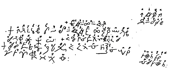 (04) Le cercle droit d’en bas renferme dans le manuscrit quatre signes mal définis, dont un c, lequel a disparu dans la figure actuelle, par suite d’un accident de gravure. (05) Origines de l’Alchimie, p. 259 et 56. [1] Du Cange. Glossarium mediœ et infimœ graecitatis. [2] Origines de l’Alchimie, p.242 à 246. [3] Même ouvrage, p. 35, 182, 242. [4] Bibliotheca chemica de Manget, t. I, p. 540, dans le traité de Geber. [5] Origines de l’Alchimie, p. 171. [6] Voir plus loin la formule de voir l’Écrevisse. — Sur le sens de ce mot appliqué à un appareil chimique, p. 145. [7] Voir aussi manuscrits 2249, folio 100 — 2325, folio 83 — 2327, folio 80 et répétition au verso; folio 220 verso. — Leide, Voss., n°47, fol. 70. [8] J’ai déjà donné cette interprétation: Origines de l’Alchimie, p. 348. — Mais la lecture actuelle est plus correcte.