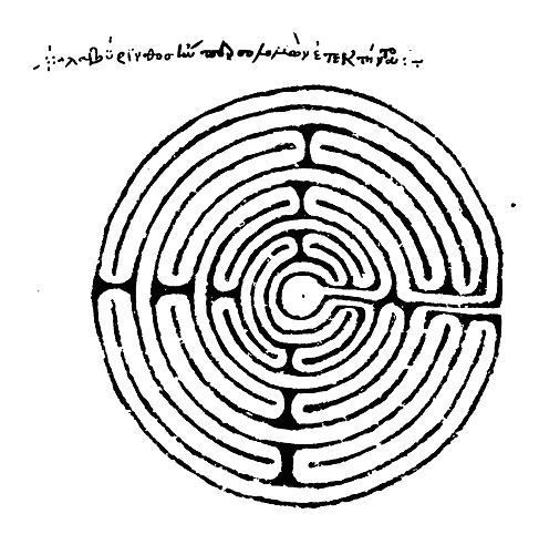 Figure 29. — Alphabets magiques. — Réduction à 1/2. — D’après décalque. En réalité, aucun de ces alphabets n’a rien de commun avec les hiéroglyphes. Ce sont simplement deux alphabets cryptographiques, formés avec des lettres grecques plus ou moins défigurées, mais sans modification dans leur nombre ou leur valeur. Il existait un grand nombre d’alphabets analogues au moyen âge. On trouve notamment une page entière d’alphabets de ce genre dans le manuscrit 2419, folio 279 Le premier alphabet de ce folio ressemble beaucoup au premier du manuscrit de Saint Marc, donné plus haut; le sixième du manuscrit 2419 ressemble aussi, quoique d’un peu plus loin, au second du manuscrit de Saint Marc. Les alphabets du manuscrit 2419 semblent, d’après leur traduction superposée en lettres rouges presque effacées, répondre à l’alphabet latin de préférence à l’alphabet grec. C’étaient là en réalité des jeux d’esprit individuels, plutôt que des alphabets usuels. En tout cas, il m’a paru intéressant de reproduire les spécimens ci-dessus, surtout le premier, qui se retrouve à peu près pareil dans deux manuscrits dissemblables de composition et d’origine. Figure 30. Cette figure (manuscrit de Saint Marc, folio 102 verso) représente le Labyrinthe de Salomon, avec un commentaire en vers p157 le tout d’une encre et d’une denture plus modernes, probablement du xive siècle.