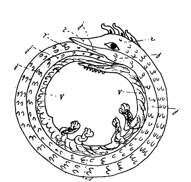 Figure 32. — Dessin mystique (2327). Décalque. Figure 33. — Dessin mystique (2325). Décalque. une opération chimique; on dirait une sorte d’équation chimique, analogue aux équations atomiques et renfermant comme les nôtres les symboles des corps intervenants. Elle se trouve au folio verso, du manuscrit 2327, vers la fin de la troisième leçon de Stephanus, vis-à-vis des mots: οὗτος ἐστὶν ὁ ἐτήσιος ὁ πάρεσμος ὁ πολύχωμος. « C’est la pierre étésienne, le support polychrome (des teintures ?). » Puis vient tout un développement mystique sur la pierre philosophale. Le relieur du manuscrit, au xvie siècle, a coupé une partie de la branche gauche du dessin. Mais il n’y avait là rien de particulier, comme le montre le manuscrit 2325 qui contient la manie figure (fol. 46, verso). On a reproduit cette dernière à côté (fig. 33). Telles sont les figures fournies par le manuscrit de Saint Marc et les dessins congénères de ces figures, reconnus dans les autres manuscrits. Figures du manuscrit 2327.Étudions maintenant les figures propres du manuscrit 2327, en commençant par les figures mystiques. Figure 34. — Cette figure (manuscrit 2327, fol. 196) est celle du serpent p159 Ouroboros(05) en tête d’un article reproduit dans le Texte grec (I, v). Il est formé de trois cercles concentriques, comme la figure supérieure de