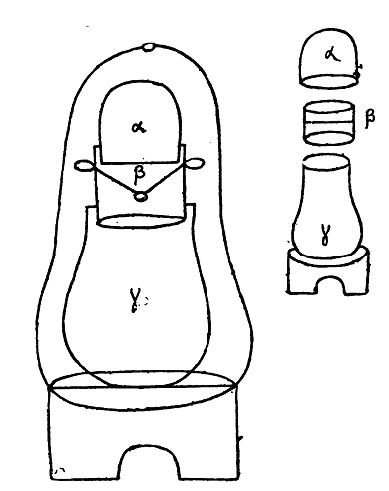 Figure 44. — Vase à digestion. — D’après un dessin. La figure de droite reproduit l’appareil à digestion des figures 37 et 38, placé de même sous une enveloppe générale en forme de cloche. Pour plus de précision, je remarquerai que mon dessinateur a raccourci les petites oreilles, situées à droite et à gauche de la lettre b. Dans le manuscrit, ces oreilles s’étendent jusqu’à l’enveloppe et la touchent, de façon à marquer la division de cette enveloppe en deux portions superposées, telles qu’elles sont dessinées en effet dans les figures 37 et 38. Cette enveloppe générale semble avoir été symbolisée par la dénomination de l’œuf philosophique. D’autre part, les trois portions intérieures de cet appareil à digestion sont dessinées à côté, séparées et superposées, de façon à en montrer nettement tout l’ajustement. p171 Avant d’en discuter la signification, donnons les inscriptions correspondantes. Elles sont d’une grécité de très basse époque. Sur le dessin de droite, la panse du matras y porte les mots : ὅμοιον ἔνε τοῦτο μετὰ τρία κομάτια (sic), c’est-à-dire : ceci reproduit les trois segments séparés du dessin qui est à côté. ) Sur le fourneau, on lit : ἐν βολβίτοις καμίνιον, c’est-à-dire: « fourneau entouré de fumier. » Au-dessous de l’ensemble de ce dessin : καρκινοειδὲς κεῖται δὲ ὁ λόγος ἔμπροσθεν : « appareil rétrograde; la description est au-dessus ». — Rappelons que ces mots caractéristiques se trouvent à côté du matras analogue des figures 37 et 38 et de l’appareil à kérotakis de la figure 25. Sur le côté, on lit, inscrits verticalement, les mots : ἐναταλωνάσι φιλίαζη κατὰ τὰ τρία κομάτια, c’est-à-dire : « dans les trois segments, on ramollit et on combine (les matières) ». Venons au dessin de gauche, qui représente les trois segments séparés, avec lettres correspondantes. On lit à côté, inscrits verticalement, les mots: τοῦτ' ἐμπνέης τὸ ἅλον καὶ τὸ ἅλον ἐντάλῳ ἡ πρῶτος, δεύτερον, τρίτον (sic) c’est-à-dire: « voici l’un des vases où l’on évapore, et l’autre où l’on ramollit; c’est-à-dire le jr le 2’, le 3’ (segment). » Ces inscriptions confirment exactement les opinions émises plus haut, relativement à l’usage de cet appareil. D’après lesdites inscriptions en effet il répond aux figures 22, 24, 25, c’est-à-dire aux appareils à kérotakis. Il suffit d’imaginer que les appareils placés au sommet des figures 22 et 25 ont été enveloppés par la sphère de la partie inférieure, pour comprendre les figures 38 et 37 : c’est toujours là l’appareil rétrograde, destiné au blanchiment du cuivre par le mercure ou par l’arsenic sublimé. Ajoutons que, les trois segments intérieurs ne sont autre chose que les trois parties des figures 20 et 21 du manuscrit de Venise, représentant des vases à digestion cylindriques. — De même la figure 27, qui en exprime une forme un peu différente, donnant en quelque sorte la transition entre la figure 20 et les figures 22, 24 et 25. Mais la figure nous permet d’aller plus loin et d’établir que ces appareils correspondent à l’aludel de Geber et des alchimistes arabes. Il suffit, pour s’en assurer, de jeter un coup d’œil sur les dessins des aludels, figure 45. p172 Nous avons ici les trois segments à digestion des alchimistes grecs; avec cette différence pourtant que les deux segments inférieurs sont réunis en un seul morceau dans les dessins des aludels. Le couvercle s’ajustait à frottement doux sur la paroi de la région moyenne : et cela dans une portion considérable de sa hauteur. Les deux morceaux extrêmes sont terminés chacun par une couronne ou bague extérieure, l’une se