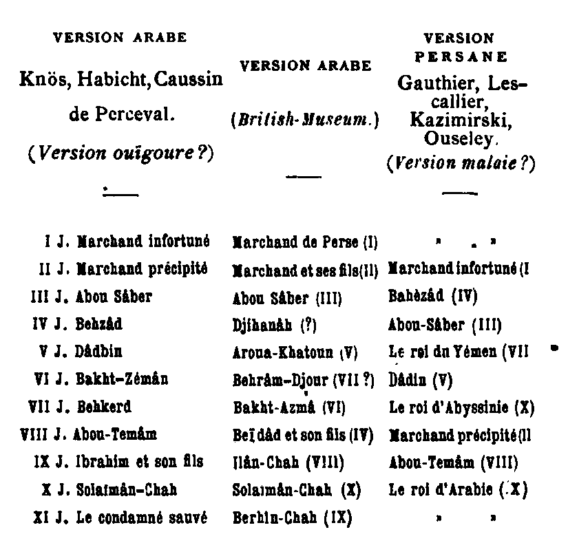 La traduction de Gauthier (nuits 443 444) suit le texte arabe, comme celle des Mille et une Nuits de l'édition Habicht (nuits 448 (.53) Celles de Lescallier et la version du texte lithographie à Pans s'accordent avec la recension d'Ouseley.