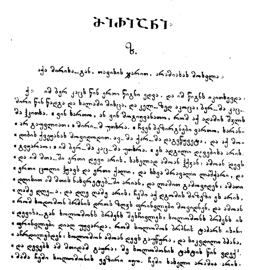 Le Miriani est écrit dans le géorgien le plus vulgaire, et fort bon, à ce qu'il me semble, pour apprendre les formules du langage usuel : c'est là son type particulier. D'une autre part, les textes géorgiens sont rares, et jusqu'à présent l'on ne possède guère que ceux qu'a publiés la Société asiatique, soit dans son Journal, soit autrement. Si l'on considère encore que le Miriani est un livre peu connu, même dans sa patrie, on comprendra qu'il eût pu être utile d'en reproduire le texte entier en même temps que la traduction ; mais quelle qu'en soit la brièveté relative, il eût peut-être occupé trop d'espace dans un simple recueil périodique. Aussi nous bornerons-nous à un extrait Nous avons choisi les chapitres vii et xvi comme formant chacun un tout complet, comme les scènes les plus intéressantes du drame; ils sont d'une longueur suffisante pour donner un échantillon du texte, et pour fournir un exercice aux personnes studieuses. D'ailleurs les chapitres précédents, jusqu'au xve, sont déjà publiés, et forment dans la Grammaire une suite de lectures graduées propres à confirmer les règles et à en faire connaître les applications.