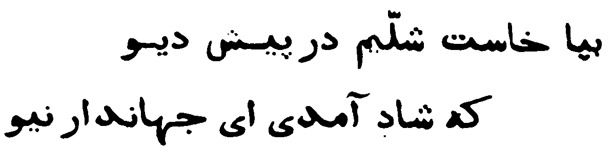[60] Je ne sais pas à quels auteurs l'écrivain fait allusion, car Schelim ou plutôt Schellim est dans la tradition épique un personnage différent de Zohak, et postérieur à lui. On le trouve par exemple comme antagoniste de Sam dans le Sam Nameh, fol. 359 et suiv. de mon manuscrit. Le mètre prouve qu'il faut lire Schellim, par exemple :