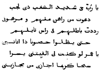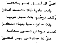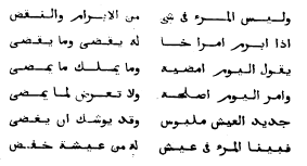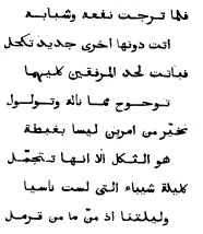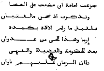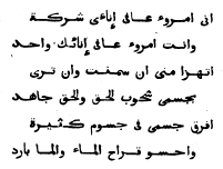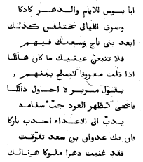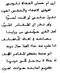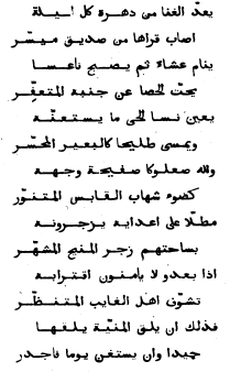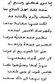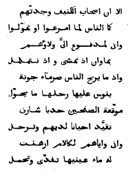 Pendant une année de disette, un certain nombre d'Absites vinrent trouver Orwa pour le prier de les commander dans une expédition. Oumm Hassan, la femme du poète,[31] concevant cette fois quelques craintes à son sujet, voulut l'empêcher de partir. Orwa se mit néanmoins à la tête de ceux qui avaient imploré son secours, et, malgré les conseils de Malek qui voulait aussi le détourner, il s'empara d'un grand troupeau de chameaux : celte excursion lui inspira plusieurs pièces de vers dont le Kitab el Aghani rapporte des fragments; le premier est une réponse aux objections de sa femme Oumm-Hassan.[32]