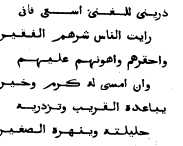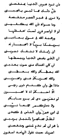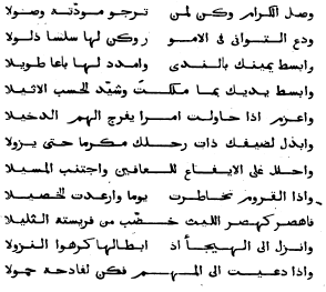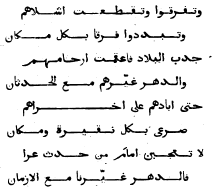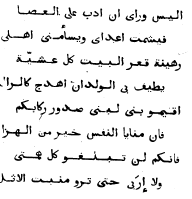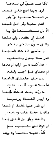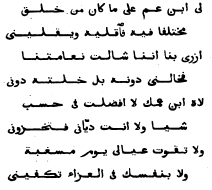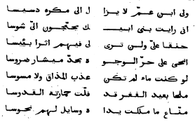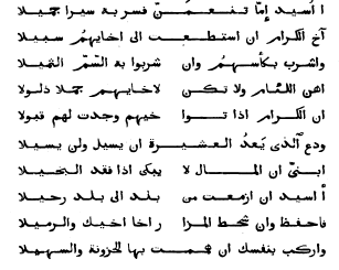 Cependant le petit-fils d'Abou-Thaleb, Abd Allah ben Djafar, avait recommandé au précepteur de son fils de ne pas lui apprendre la pièce suivante d'Orwa, craignant que l'amour de la richesse qui y est exalté ne l'encourageât à sortir de son pays.