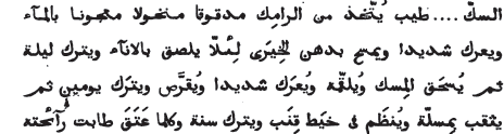 « Socc est une sorte de parfum qu'on fait avec du ramic pilé, tamisé, et pétri avec de l’eau. On le frotte fortement, et on l'enduit d'huile de violette, pour qu'il ne s'attache pas au vase. On le laisse une nuit, puis on broie du musc; on le lui fait absorber, on le » frotte fortement, et on en fait des pastilles qu'on laisse deux jours : » ensuite on les perfore avec une aiguille et on les enfile sur un fil de chanvre: on les laisse un an; et plus elles sont vieilles, plus leur odeur est agréable. »