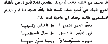 Le charme de ses paroles, disait Isa, fils de Héscham, me transporta; je jetai loin de moi le voile du sommeil, et je courus vers le lieu où une foule était assemblée autour de ce personnage. Que vis-je ! Abou'lfath Escanderi, tenant à la main une épée hors du fourreau, et caché sous un déguisement étrange. Quand il m'aperçut, il me fit signe [pour que je gardasse le silence], et il dit: Que Dieu daigne faire miséricorde à quiconque se conduit bien avec ses amis et sait se posséder lui-même (16), à quiconque nous assiste de son superflu, et partage avec nous les dons qu'il a reçus. Ensuite il accepta ce qu'on lui donna. Quand je fus seul avec lui, je lui dis: Est-ce que la terre des Grecs t'a donné le jour (17)! Il me répondit par les vers suivants :