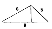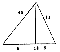 Si tu as un triangle acutangle dont les côtés sont inégaux, sache que sa mesure se connaît par son masquèt al hadjar et sa colonne. Soit un triangle dont un côté est 15 derâa, un côté 14 derâa, et un côté 13 derâa. Si tu veux connaître son masquèt al hadjar, prends pour base celui des côtés qu'il te plaira, prenons celui de 14. Son masquèt al hadjar tombe sur ce côté à la distance chéy (x) à partir de celui des deux côtés adjacents que tu voudras. Posons le chéy à partir de l'adjacent 13. Multiplions-le par lui-même, il devient un mâl (x²) ; retranchons-le de treize par lui-même, c'est-a-dire de 169, cela devient 169 moins mâl. Nous savons que la racine de cela, c'est la colonne. Il nous est resté de la base 14 moins chéy. Nous multiplions ce reste par lui-même, il en résulte 196 et mâl moins 28 chéy. Nous le retranchons de 15 par lui-même, le reste est 29 derhems[17] et 28 chéy moins mâl. La racine est la colonne. Or la racine de 169 moins mâl, c'est encore la colonne. Toutes deux sont donc égales. Compare-les, c'est que tu rejettes le mâl avec le mâl, car les deux mâl sont négatifs. Alors il reste 29 et 28 chéj égal à 169. Rejette 29 de 169, il reste 140 égal à 28 chéy. Un seul chéy est 5. C est le masquèt al hadjar à partir du côté adjacent, 13. Le complément de la base, contigu à l'autre côté, c'est 9. Si tu veux connaître la colonne, multiplie ce 5 par lui-même, puis soustrais le produit du côté contigu, 13, multiplié par lui-même. Il reste 144. La racine de cela est la colonne. C'est 12. La colonne tombe toujours sur la base suivant deux angles droits, et c'est pour cela qu'on la nomme justement colonne. Multiplie la colonne par la moitié de la base, c'est-a-dire par 7, tu obtiens 84 et c'est la mesure du triangle.[18] Voici la figure[19] :