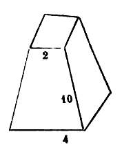 Si l'on dit : dans un pilier pyramidal la base est quatre derâa par quatre derâa, la hauteur dix derâa, et la tête deux derâa par deux derâa. Nous savons bien que toute pyramide entière a la tête terminée en pointe, et que un tiers de la mesure de sa base multiplié par sa colonne, c'est sa propre mesure. Comme ce pilier-ci n'est pas terminé en pointe, nous voulons savoir de combien l'élever pour rétablir la tête, car il n'a pas de tête. Or nous avons appris que le dix est à la hauteur totale comme le deux est au quatre; mais le deux est la moitié du quatre, donc puisque cela est ainsi, le dix est la moitié de la hauteur. Et la hauteur totale est vingt derâa. Maintenant que nous connaissons la hauteur, prenons un tiers de la mesure de la base, c'est 5 ⅓, multiplions-le par la hauteur qui est vingt derâa; cela s'élève à 106 derâa et 2/3 derâa. Nous en retrancherons ce que nous avions ajouté afin de le terminer en pointe, c'est-à-dire un tiers de la mesure 2 par 2, ou 1 ⅓, multiplie par dix, ce qui fait 13 et ⅓. Et c'est là la mesure de ce que nous lui avons ajouté pour qu'il fût terminé en pointe. Si nous enlevons cela de 106 derâa et 2/3 derâa, il reste 93 derâa et ⅓, et c'est là la mesure du pilier pyramidal.[21] Voici la figure :