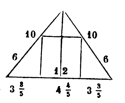 Si l'on dit: une pièce de terre est un triangle dont deux côtés sont dix derâa, dix derâa, et la base douze derâa; elle est circonscrite à une pièce de terre qui est un carré, combien chaque côté du carré ? Pour le déterminer, il faut que tu connaisses la colonne du triangle; multiplie la moitié de la base, c'est-adire six, par elle-même, ce qui donne 36, retranche cela de l'un des deux plus petits côtés multiplié par lui-même, c'est-à-dire de 100, il reste 64, prends-en la racine, 8; c'est la colonne. La mesure du triangle est 48 derâa, résultat de la multiplication de la colonne par la moitié de la base, qui est six. Nous posons un des côtés du carré, chéy (x); nous le multiplions par lui-même, il en résulte mâl (x²), nous le gardons. Nous savons qu'il nous est resté deux triangles aux deux côtés du carré, et un triangle au-dessus de lui. Or les deux triangles fixés aux deux côtés du carré sont égaux entre eux, leurs colonnes étant les mêmes et formant entre elles un angle droit. Leur mesure, c'est que tu multiplies chéy par 6 moins ½ chéy, ce qui est 6 chéy moins ½ mâl; telle est la mesure de la somme des deux triangles qui sont fixés aux deux côtés du carré. La mesure du triangle placé au dessus, c'est que tu multiplies huit moins chéy, qui est sa colonne, par la moitié de chéy. C'est quatre chéy moins un demi mâl. Tout cela additionné ensemble c'est la mesure du carré et la mesure des trois triangles; et c'est dix chéy. Tu l'égales avec 48, qui est la mesure du grand triangle. Il suit de là qu'un chej est 4 derâa et 4/5 derâa. Et c'est là chaque côté du carré.[22] Voici la figure :