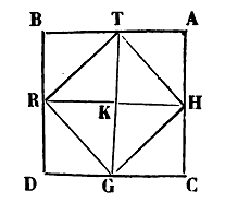 Sache que dans tout triangle rectangle, chacun des deux plus petits côtés étant multiplié par lui-même, les produits additionnés égalent le produit du plus grand côté multiplié par lui-même. Voici qui le démontre : Je trace un quadrilatère équilatéral et équiangle ABCD, je coupe !e côté AC en deux moitiés au point H, et je mène HR, puis je coupe le côté AB en deux moities au point T, et je mène TG. La surface ABCD est devenue quatre surfaces ayant leurs côtés et leurs angles égaux, savoir : surface AK, surface CK, surface BK et surface DK. Ensuite je tire du point H au point T une ligne, elle coupe la surface AK en deux moities. Cette surface a donné naissance à deux triangles, qui sont les triangles ATH et HKT. Or, il est bien évident pour nous que AT est la moitié de AB, que AH lui est égal comme moitié de AC, et que la ligne TH leur sous-tendante est la corde d'un angle droit. Je tire de même des lignes de T à R, de R à G, et de G à H. L'ensemble des carrés donne naissance à huit triangles égaux, et il est bien clair pour nous que quatre de ces triangles sont la moitié de la plus grande surface, c'est-a-dire de AD. Il est évident pour nous que la ligne AT (multipliée) par elle-même est la mesure de deux des triangles, et que AH par elle-même est la mesure de deux triangles qui leur sont égaux, la somme est donc la mesure de quatre triangles. Mais d'autre part le côté HT par lui-même est la mesure de quatre triangles. Enfin il est clair pour nous que la ligne AT par elle-même et AH par elle-même donnent une somme égale au résultat de la multiplication de TH par elle-même, c'est là ce que nous voulions montrer. Voici la figure[12] :