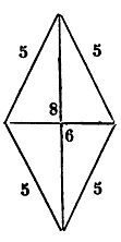 Soit le rhombe équilatéral dont chaque côté est cinq derâa, l'une de ses diagonales est huit, et l'autre six derâa. Apprends quelle est sa mesure, lorsque tu connais les deux diagonales ou l'une d'elles. Si tu connais les deux diagonales en même temps, c'est que tu multiplies l'une d'elles par la moitié de l'autre, c'est la sa mesure; ainsi tu multiplies huit par trois, ou quatre par six, ce qui fait vingt-quatre derâa, et c'est la mesure. Si tu connais une seule diagonale, tu sais bien qu'il y a deux triangles dans chacun desquels deux côtés sont cinq derâa, cinq derâa, leur troisième côté étant la diagonale. Calcule-les selon le calcul des triangles. Voici la figure :