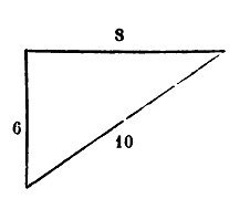 Le triangle rectangle est celui qui a deux colonnes et un diamètre (pour côtés); il est la moitié d'un quadrangle. Tu connais sa mesure, en multipliant un des deux côtés adjacents à l'an«le droit par la moitié de l'autre. Ce qui en résulte, c'est sa mesure. Exemple d'un triangle rectangle : un de ses côtés six derâa, un de ses côtés huit derâa, et le diamètre dix. Pour faire le calcul, tu multiplies six par quatre, ce qui donne vingt-quatre derâa, et c'est la mesure. S'il te plait de faire le calcul du triangle par la colonne, ce n'est que sur le plus grand côté que tombe sa colonne, car les deux plus petits côtés sont deux colonnes. Si tu veux cela, alors multiplie sa colonne par la moitié de sa base; ce qui en résulte, c'est sa mesure. Voici la figure :