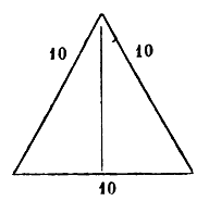 La deuxième espèce. — Soit à mesurer un triangle équilatéral acutangle dont chaque côté a dix derâa. Tu détermines d'abord son masquèt al hadjar[15] et sa colonne. Sache que dans tout triangle isocèle, si tu mènes la colonne sur la basé, elle tombe à angles droits sur le milieu de la base, si les deux côtés sont égaux; s'ils sont inégaux, le masquèt al hadjar n'est pas au milieu de la base. Mais nous savons que dans ce triangle-ci, sur quelque côté que lu opères, le masquèt al hadjar ne sera jamais qu'en son milieu; et c'est cinq derâa. Pour connaître la colonne, lu multiplies le cinq par lui-même, et tu multiplies un des côtés, c'est-a-dire dix, par lui-même, ce qui fait cent; tu retranches de ce produit celui de cinq par lui-même, c'est-a-dire vingt-cinq; il reste soixante quinze. Tu en prends la racine, c'est la colonne, et elle est devenue un côté des deux triangles rectangles. Si tu veux la mesure, multiplie la racine de 75 par la moitié de la base, qui est 5; pour cela tu multiplies le 5 par lui-même, afin d'avoir la racine de 75 par la racine de 25; multiplie 75 par 25, c'est 1875; prends-en la racine, c'est la mesure du triangle. Et c'est 43 et peu de chose.[16] Voici la figure: