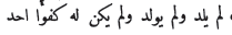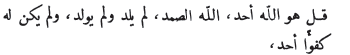 On se convaincra facilement que le Kitâb al-madjmoû’ est un dérivé d’écrits ismaélis : tous les noms propres sont ceux de personnages ismaélis. Les docteurs nosaïris ont poussé la glorification d’'Alî jusqu’à son identification avec Dieu. On leur doit l’invention du symbole ain-mîm-sîn qui joue un si grand rôle dans les cérémonies religieuses. Mais grâce à l’interprétation allégorique dont le commentaire de Soleïman nous donne un exemple, bien des passages de l’ancien texte, en contradiction apparente avec la religion nouvelle, nous ont été conservés. Les écrits ismaélis qu’utilisaient les scribes nosaïris n’avaient pas été composés autrement, en prenant pour base le Coran. L’esprit oriental s’attache si bien aux formules, que malgré un long détour, nous retrouvons dans les écrits nosaïris des versets du Coran presque intacts. Il n’y a aucun doute que ces passages du Coran se transmettaient oralement.[6] Pour en donner un exemple, voici Coran, sour. 112