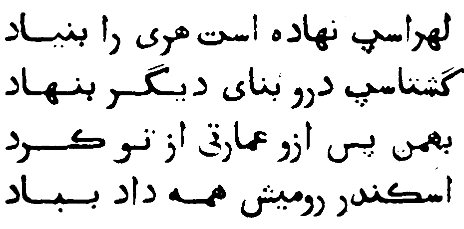 Lohrasp jeta les fondements de Herat. Guschtasp y ajouta d'autres édifices. Après lui, Behmen bâtit une ville nouvelle, dont la ruine totale fut l'œuvre d'Alexandre le Grec.