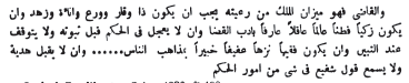 Lorsque l'on confie un emploi à un fonctionnaire il faut lui recommander d'user de bienveillance à l'égard des créatures de Dieu, que son nom soit honoré et respecté ! On ne doit exiger d'elles que ce qui est juste et on doit le leur réclamer avec douceur et ménagement. Il est indispensable de ne rien exiger avant l'époque fixée pour la perception des impôts; lorsqu'on en fait la demande avant ce moment-là, les populations éprouvent de la gêne et lorsqu'elles doivent acquitter les taxes que l'on veut prélever de la sorte, elles vendent, contraintes par la nécessité, leurs denrées à moitié prix, se ruinent et se dispersent.