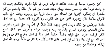 Quelques jours après le départ de Behram Gour, la femme de cet homme lui dit : « Va, rends-toi à la ville en emportant cette flèche. Ce cavalier si bien équipé est, sans aucun doute, un personnage riche et respectable. S'il ne te fait que peu de bien, ce peu aura aujourd'hui pour nous une grande valeur. Secoue la paresse, car les paroles d'un tel homme ne sauraient être négligées. » Il partit, se dirigea vers la ville, où il passa la nuit, et le lendemain, il se rendit à la cour de Behram Gour. Ce prince avait recommandé à ses chambellans et à ses officiers de lui amener sans retard l'individu que l’on verrait ayant à la main une de ses flèches. Lorsqu'il fut aperçu par les chambellans, ceux-ci lui dirent : « O brave homme! où es-tu donc? Voici plusieurs jours que nous t'attendons. Arrête-toi ici afin que nous le conduisions auprès du maître de cette flèche. »