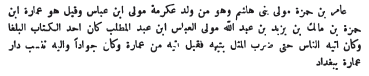 [105] Abdallah ibn el-Abbas ben Abdel-Mouthallib ben Hachim ben Abd el-Minaf el-Qourachy el-Hachimy. Il avait le kounièh d'Aboul Abbas. Sa mère, Oumm el-Fadhl Imamèh el-Hilalièh, était la fille d'el-Hârith.