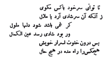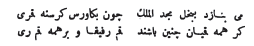 [51] Naçr-Khan Chems oul-Moulk était le fils de Thoumghadj-Khan. Il succéda à son père dans le gouvernement de la Transoxiane en l'année 460 (1068); il mourut à la fin du mois de zilquadèh 472 (mai 1080). Il eut pour successeur son frère Khizr-Khan. Chems oul-Moulkh était un prince remarquable par ses connaissances littéraires, son éloquence et sa valeur. Il possédait un remarquable talent de calligraphie.