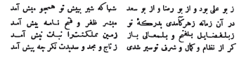 [48] On peut consulter, au sujet du paiement de gratifications fait sur un ordre verbal du souverain, l'anecdote rapportée par Aly Safy au sujet d'une libéralité faite par Mirza Bayqara au poète Bouroundouq. Ce passage du Lethaif out-Thewaif a été inséré dans la Chrestomathie persane, tome I, p. 118 du texte.