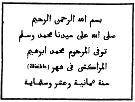 Au nom de Dieu clément et miséricordieux ! que la bénédiction et le salut de Dieu soient sur notre seigneur Mahomet! Ci-gît Mohammed Ibrahim el-Merrâkechi (le Marocain), mort dans le mois (illisible) de l'année 618. »