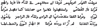 Les kathas au plumage cendré ne parviennent à boire que mes restes, après qu'ils ont volé toute une nuit d'un vol lourd et bruyant pour se désaltérer au matin. Nous partons ensemble, excités par le même désir. C’est à qui arrivera le premier à la citerne. Les kathas, avec leurs ailes pendantes et leur vol pénible, rassemblent à des gens dont la course est entravée par leurs robes flottantes; moi, au contraire, de qui la blouse est relevée dans ma ceinture, je les devance sans effort, et deviens le chef de leur troupe. Ma soif étanchée, je m'en vais. C'est alors qu'ils arrivent et s’abattent sur le bord de la citerne, à l'endroit même où l'eau dégouttait de ma main; là ils enfoncent jusqu'au jabot leurs cous dans la vase. Le tapage qu'ils font autour de ce réservoir est comme celui d'une tribu voyageuse au moment où elle s'arrête pour camper. Ils affluent de tous côtés à ce rendez-vous commun, qui les reçoit et les rassemble ainsi qu'un abreuvoir rassemble autour de lui les chameaux du camp voisin. Après avoir bu en toute hâte, ils partent aux premiers rayons de l’aurore, tels qu’une bande de la tribu d'Ohazha déguerpit le matin aux approches du danger.