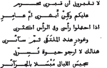 Je ne suis pas de ces pasteurs sujets à la soif qui, n'osant s'écarter des puits, font paître au soir leurs troupeaux dans des lieux sans cesse parcourus et dépouillés de verdure; les petits de leurs chameaux font pitié à voir, quoique les mères n'aient point d'entraves aux mamelles. — Je ne suis point de ces lâches et stupides époux qui, toujours auprès de leurs femmes, les tiennent au courant de tout et les consultent sur tout ce qu'ils ont à faire; — ni de ces cœurs d'autruche qui montent et baissent comme portés sur les ailes d'un petit oiseau; — ni de ces marchands de musc, rebut de leur famille, qui ne sont bons qu'à singer l'amour, qui soir et matin se parfument et se teignent les paupières en noir ; — ni de ces hommes chétifs et inertes qui cachent toujours un mal derrière un bien, qui ne portent point d'armes et s'épouvantent d'une menace ; — je ne suis pas non plus de ces voyageurs pusillanimes que les ténèbres saisissent d'effroi quand, une fois égarés dans le désert, ils n'ont devant eux qu'une vaste plaine sans route frayée ni moyens de reconnaissance.