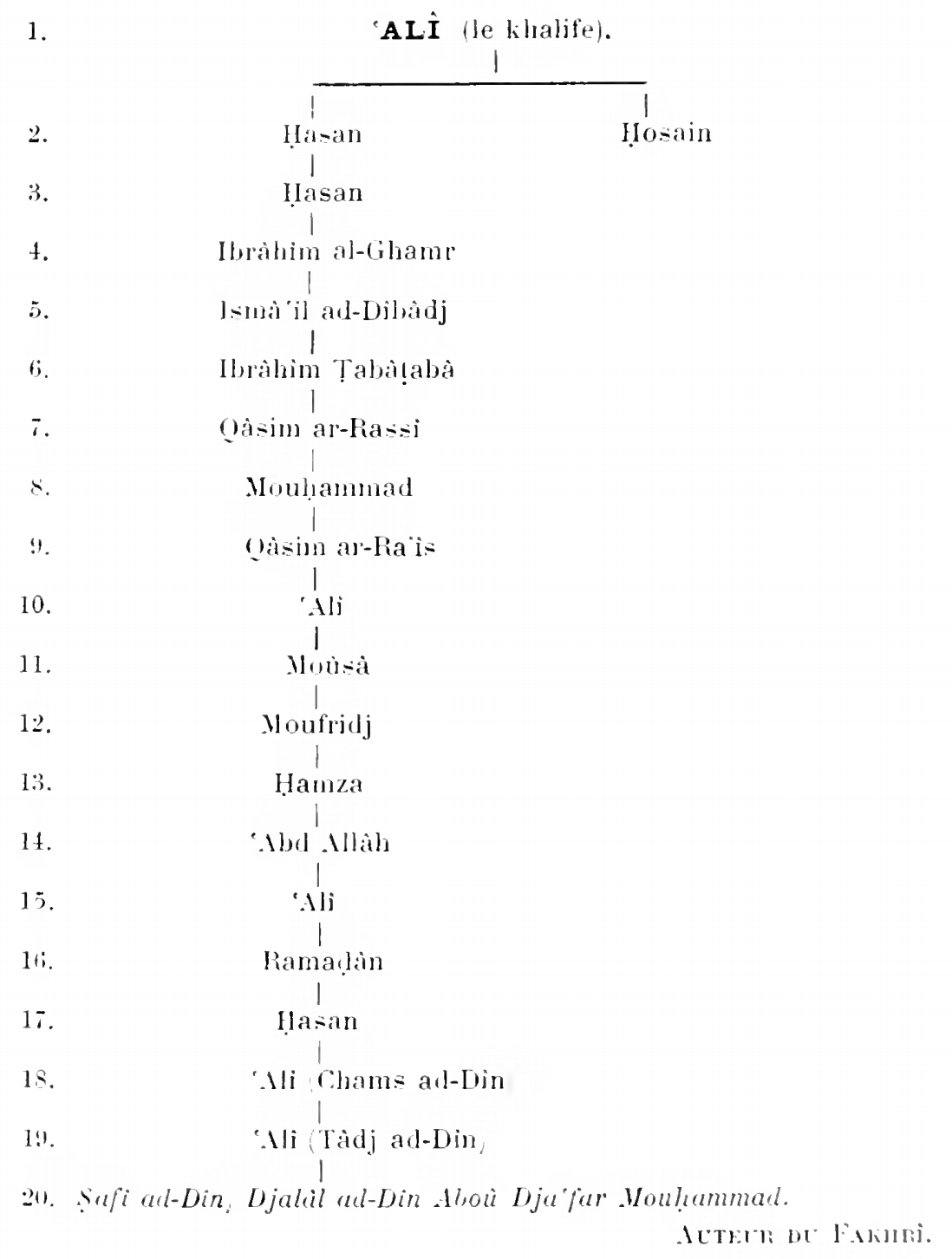 D’après les frontispices des deux manuscrits du Fakhrî,[6] le laqab ou surnom honorifique de notre auteur serait Safî ad-Din. Mais dans le manuscrit 9403[7] de Berlin, dont M. Ahlwardt a extrait le passage relatif à notre auteur, celui-ci est appelé Djalal ad-Din et non Safî ad-Din. Cette divergence sur le laqab n'a rien d'étonnant; sans être très fréquente, la coexistence de deux laqab différents pour une même personne paraît établie par des exemples assez nombreux. En plus du laqab, le manuscrit de Berlin nous fait connaître pour la première fois la kounya ou surnom patronymique de notre auteur : c'est Abou Djafar. Enfin ce même manuscrit, en donnant la généalogie de notre auteur, y introduit deux générations de plus et quelques modifications dans les noms de ses ancêtres. Voici son arbre généalogique jusqu'au khalife 'Ali : Djalal ad-Din Abou Djafar Muhammad, fils de Tadj ad-Dîn Abou-l-Hasan 'Ali, fils de Chams ad-Dîn 'Ali, fils de Hasan, fils de Ramadân, fils d'Ali, fils d’Abd-Allah, fils de Hamza, fils de Moufridj, fils de Moussa, fils d’Ali, fils de Qasim ar-Ra'is, fils de Muhammad, fils de Qasim ar-Rassi, fils d'Ibrahim Tabâtabâ, fils d'Ismâ’îl ad-Dîbâdj, fils d'Ibrahim al-Ghamr, fils de Hasan, fils de Hasan, fils d'Ali le khalife.