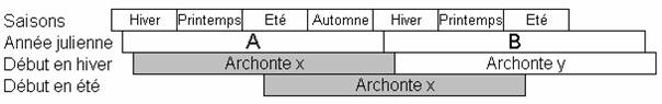 III- Les causes des difficultés :III.1- Commencement de l’année athénienne :Les événements de l’histoire grecque sont souvent datés d’après l’archonte éponyme athénien en fonction. Il est donc important de connaître la période de l’entrée en fonction des archontes car, selon que l’on place celle-ci en été ou en hiver, un événement peut être décalé jusqu’à une année complète. Par exemple un événement daté au printemps l’année de l’archonte x sera daté de l’année A si l’on considère que l’archonte est entré en fonction en hiver ou de l’année B si l’on considère qu’il est entré en fonction en été (figure 1). De nos jours, le point de vue selon lequel l’année civile athénienne a toujours commencé en été semble faire l’unanimité puisque l’on essaie même plus de le prouver[33]. Cette opinion fut présentée pour la première fois par Fréret[34], et développée surtout par Clinton[35]. Suivant l’opinion de Scaliger[36], Koutorga, comme la majorité des spécialistes de son temps, pensait qu’à l’époque des guerres médiques l’année athénienne commençait en hiver[37]. Il soutient, comme avant lui Dodwell[38], Corsini[39] et Larcher[40], que le commencement de l’année n’a été fixé en été qu’en 432 par l’astronome grec Méton au moment où celui-ci proposa le fameux cycle de dix-neuf ans qui porte son nom. Ceux-ci s’appuient sur le témoignage d’Avienus, auteur du IVe siècle, qui rapporte ce fait sous une forme poétique :